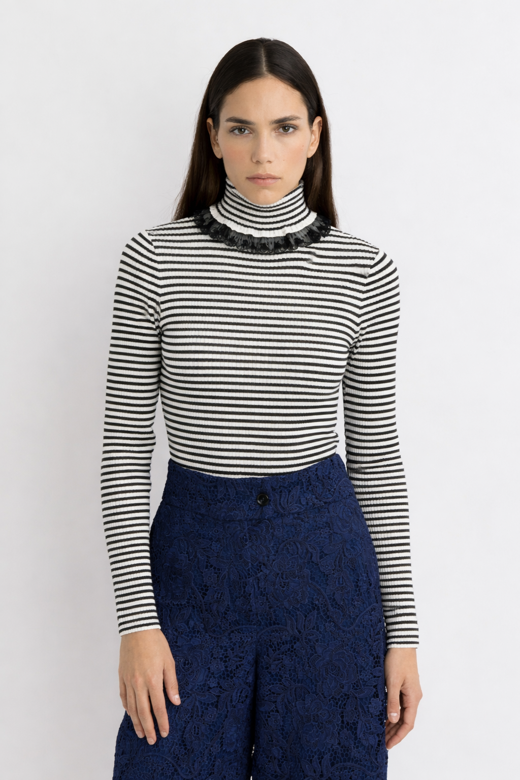 This waffle-knit top with a rolled turtleneck is enhanced with delicate lace trim, adding a feminine and refined touch to its texture and timeless cut.