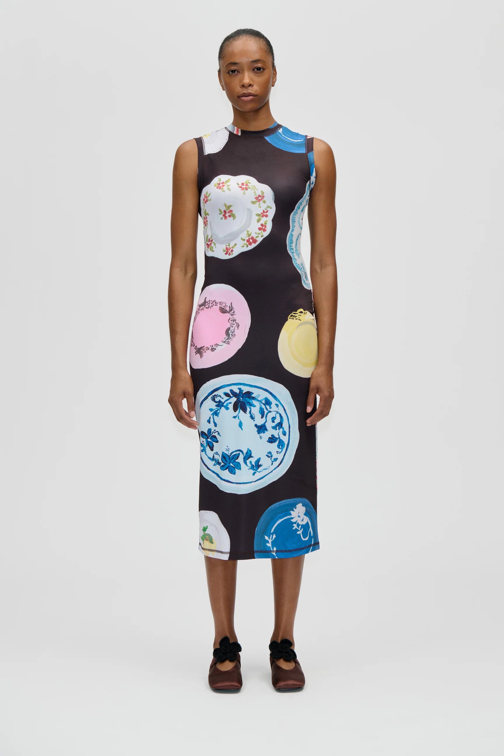 Dark brown sleeveless midi dress adorned with a hand-painted plate artwork. Designed in a sleek bodycon silhouette, crafted from a soft and stretchy material for a comfortable and flattering fit.